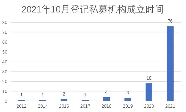 上圖為2021年10月通過的私募基金管理人成立時間圖。由圖可見,成立時間的跨度從2012至2021年,新登記的管理人多為2021年新注冊成立,共有76家;2020年成立的新登記的管理人也占多數,有18家。可見通過的私募基金管理人多為近兩年成立的新機構。