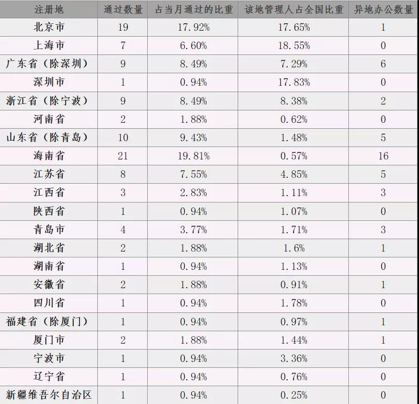 本月異地辦公的新登記私募基金管理人有44家,其中海南省異地辦公數量最多,有16家。與上月新登記的異地辦公私募基金管理人(74家)相比有所減少。