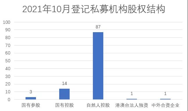 上圖為2021年10月登記私募基金管理人股權結構圖。在2021年10月登記的106家私募基金管理人中,有87家私募基金管理人完全由自然人股東出資,占比約82.07%。有14家為國有控股,有3家為國有參股,有1家港澳臺法人獨資,1家中外合資企業。